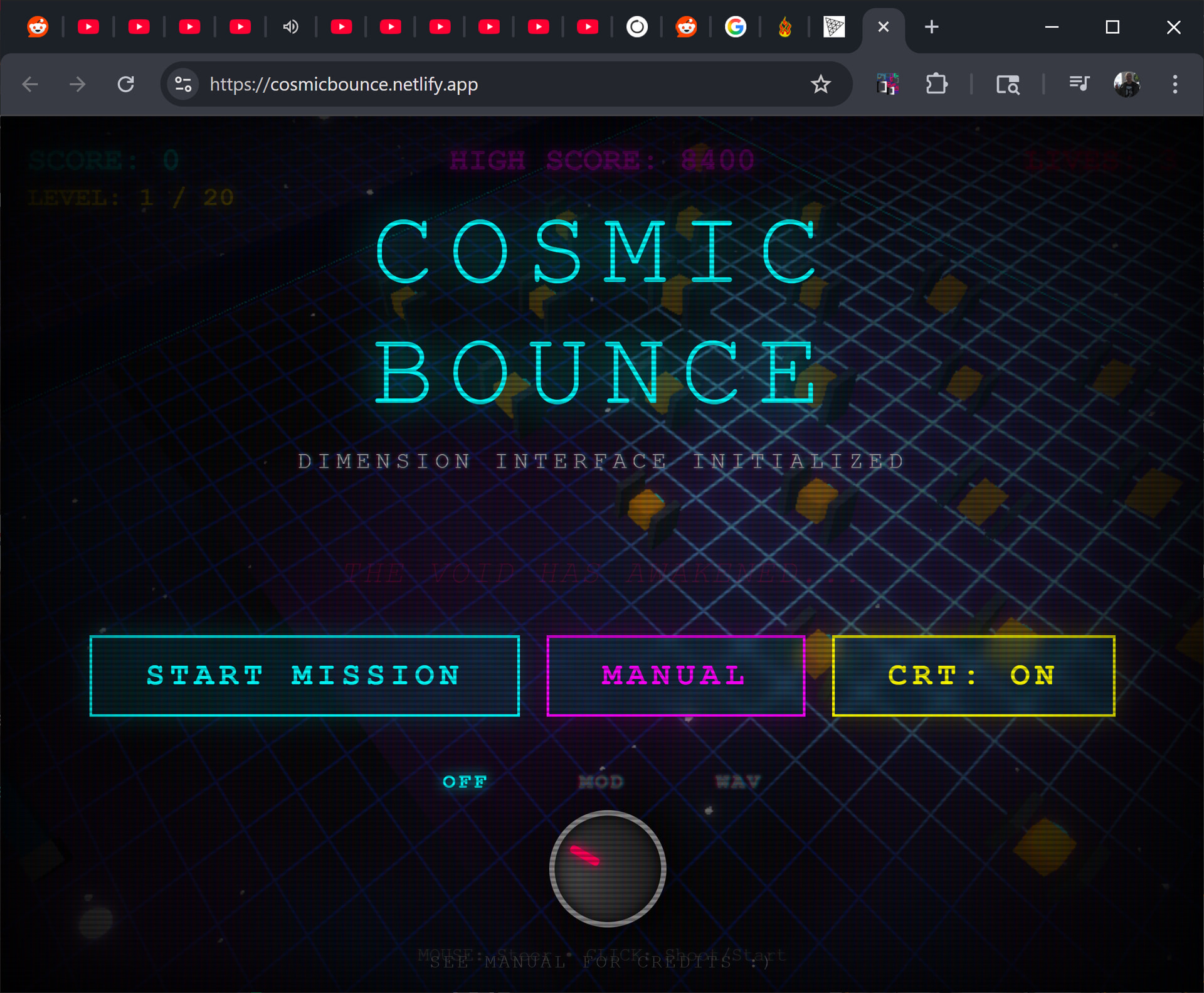Cosmic Bounce is a retro-futuristic, 3D arcade game that blends the mechanics of Arkanoid/Breakout with the encroaching enemy pressure of Space Invaders. It is built using Three.js for 3D rendering and features a comprehensive custom audio engine.