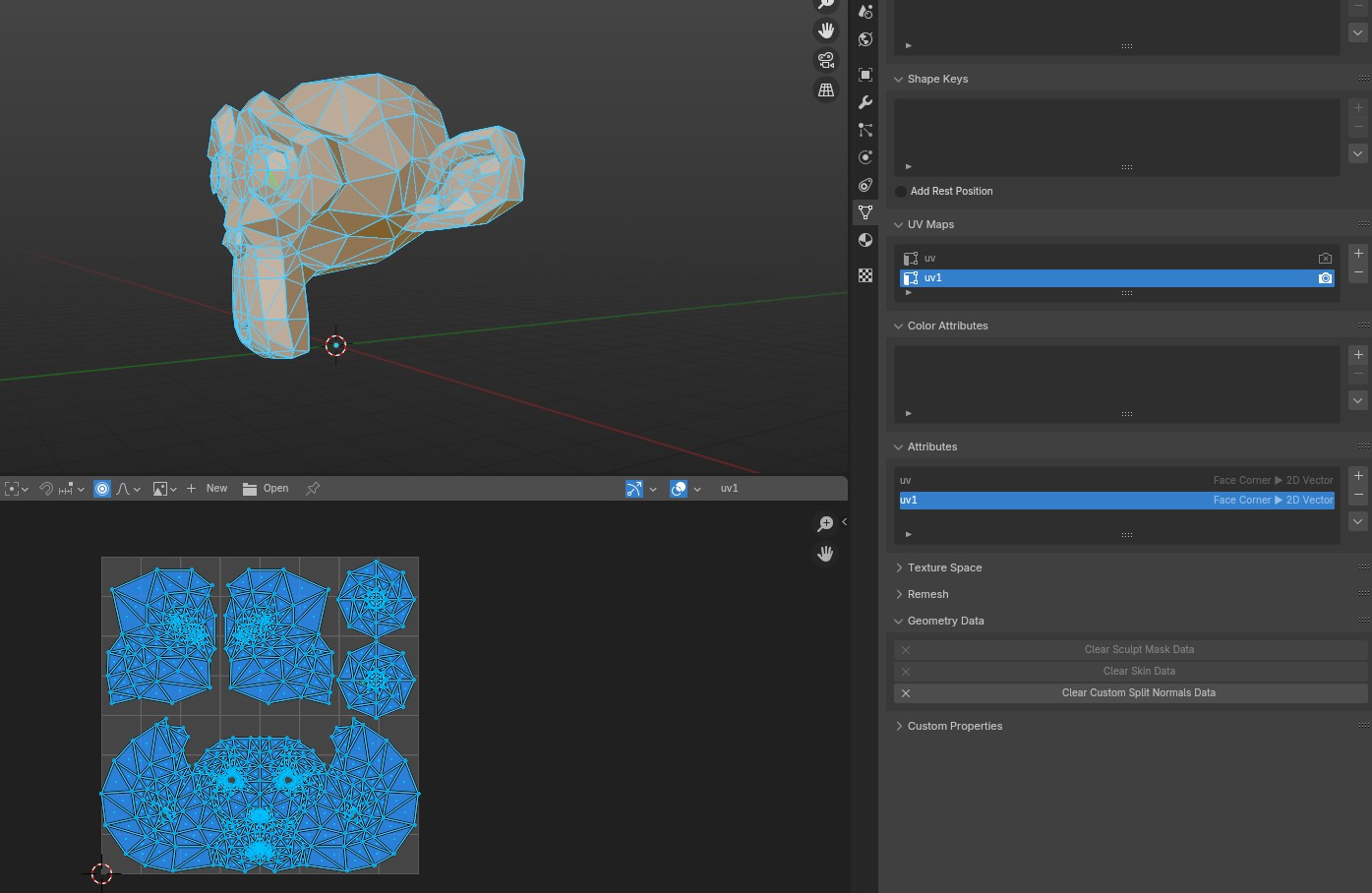 4 - Import this new GLB in Blender, just to check that everyting is correct (“uv” is the original one, new “uv1” is definitely there)
