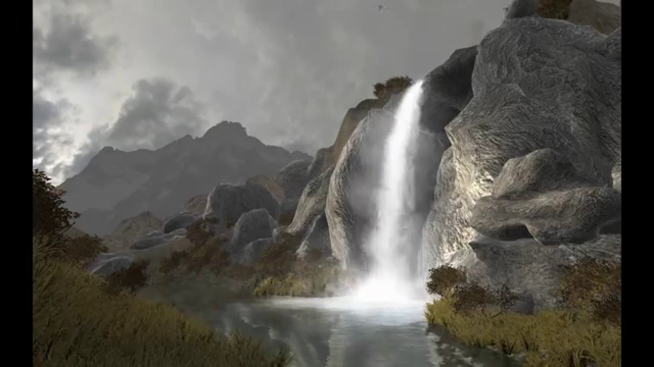 And, regardless of whether you use three.js or Blender, you might be able to simplify the design by creating a static model of a waterfall with a basic blue background and then overlay that with a transparent texture that will give the appearance of water flowing downhill.