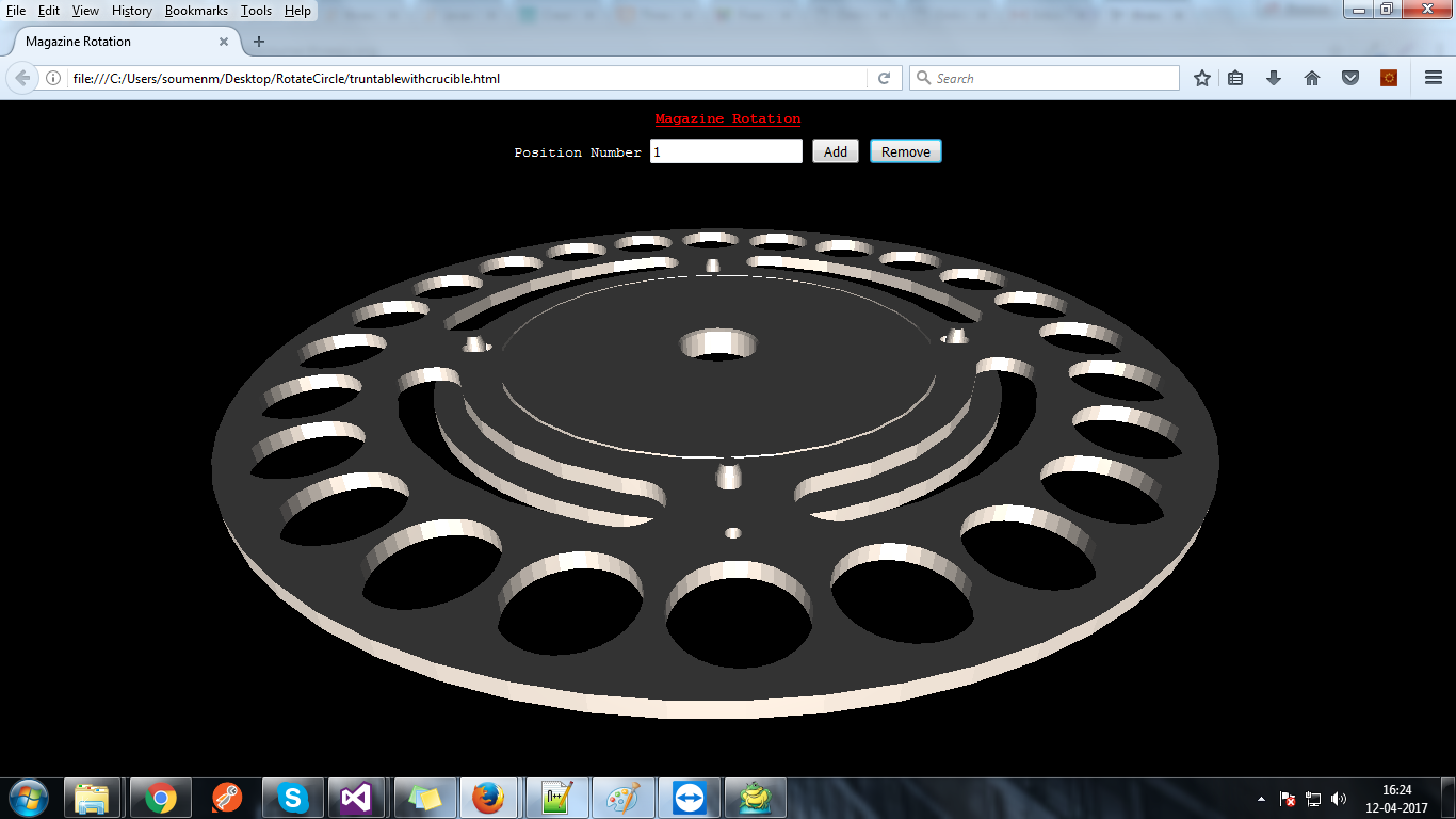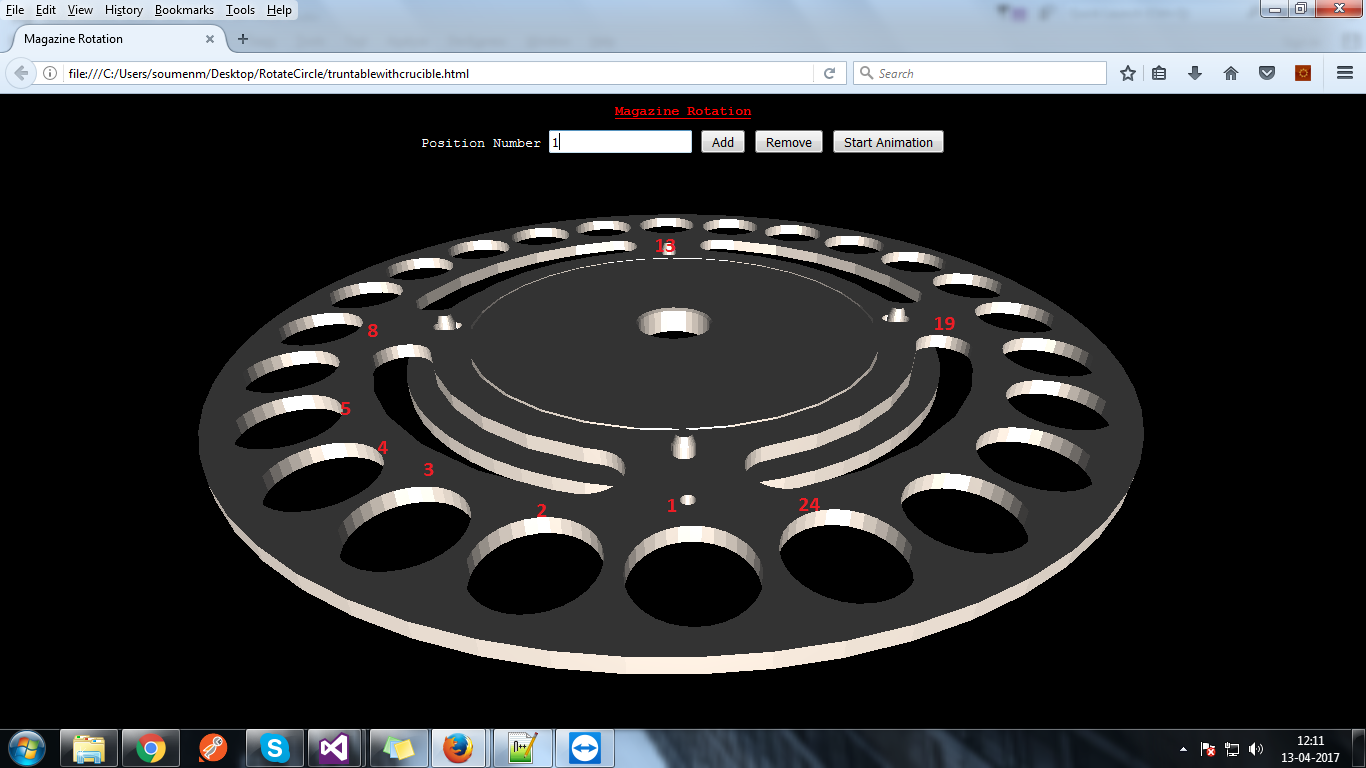 I have make a animation using two obj file. In first obj file have 24 hole. I want to rotate the first obj file.If i give position 3 obj file rotate and 3 position came front of the screen.Attach obj file image.