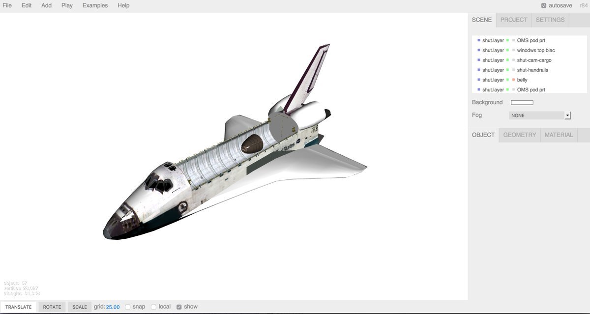 Here is one of the space shuttle in the three.js editor: