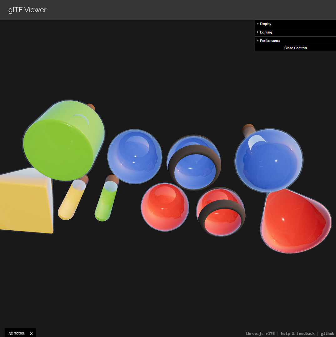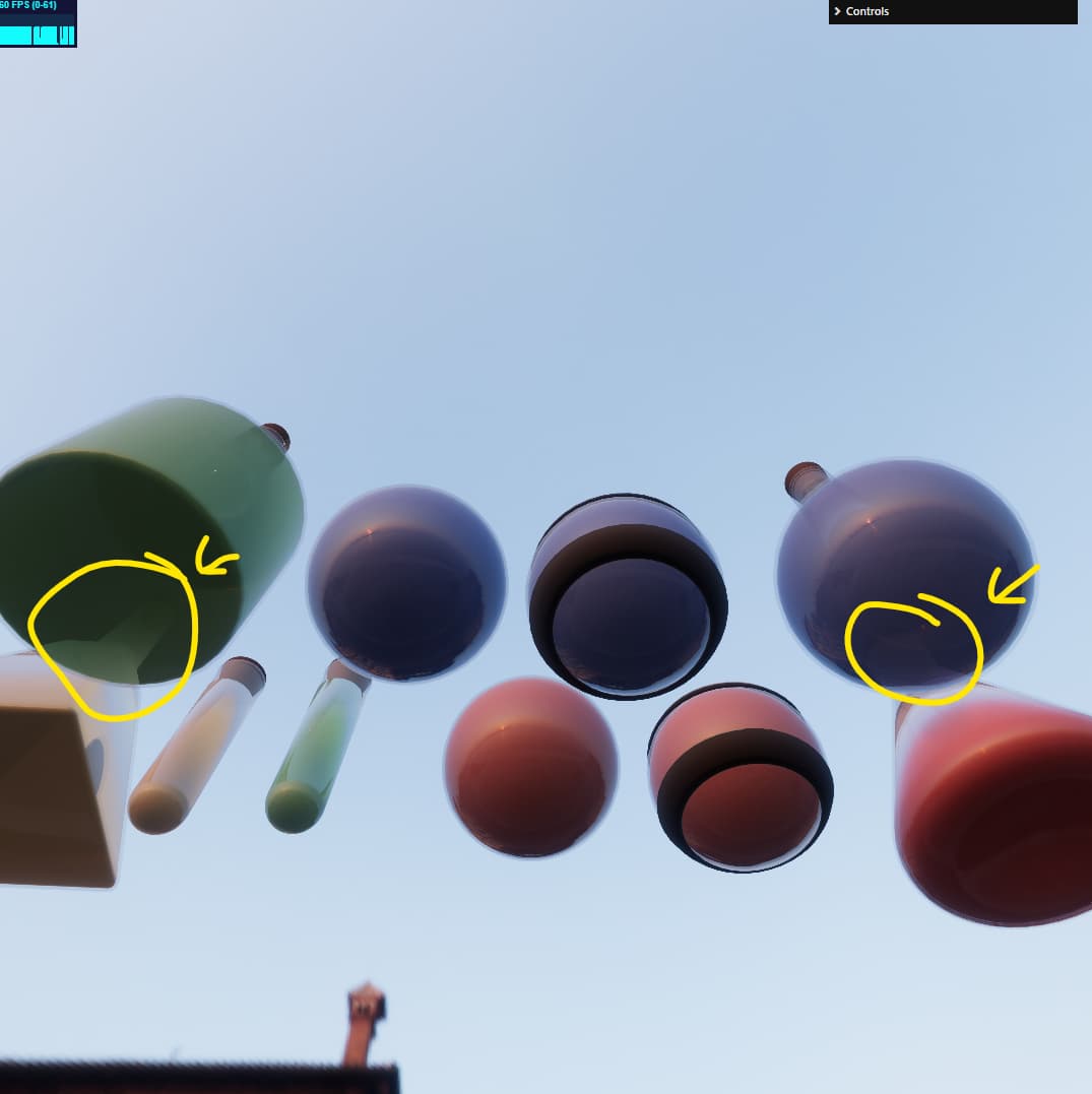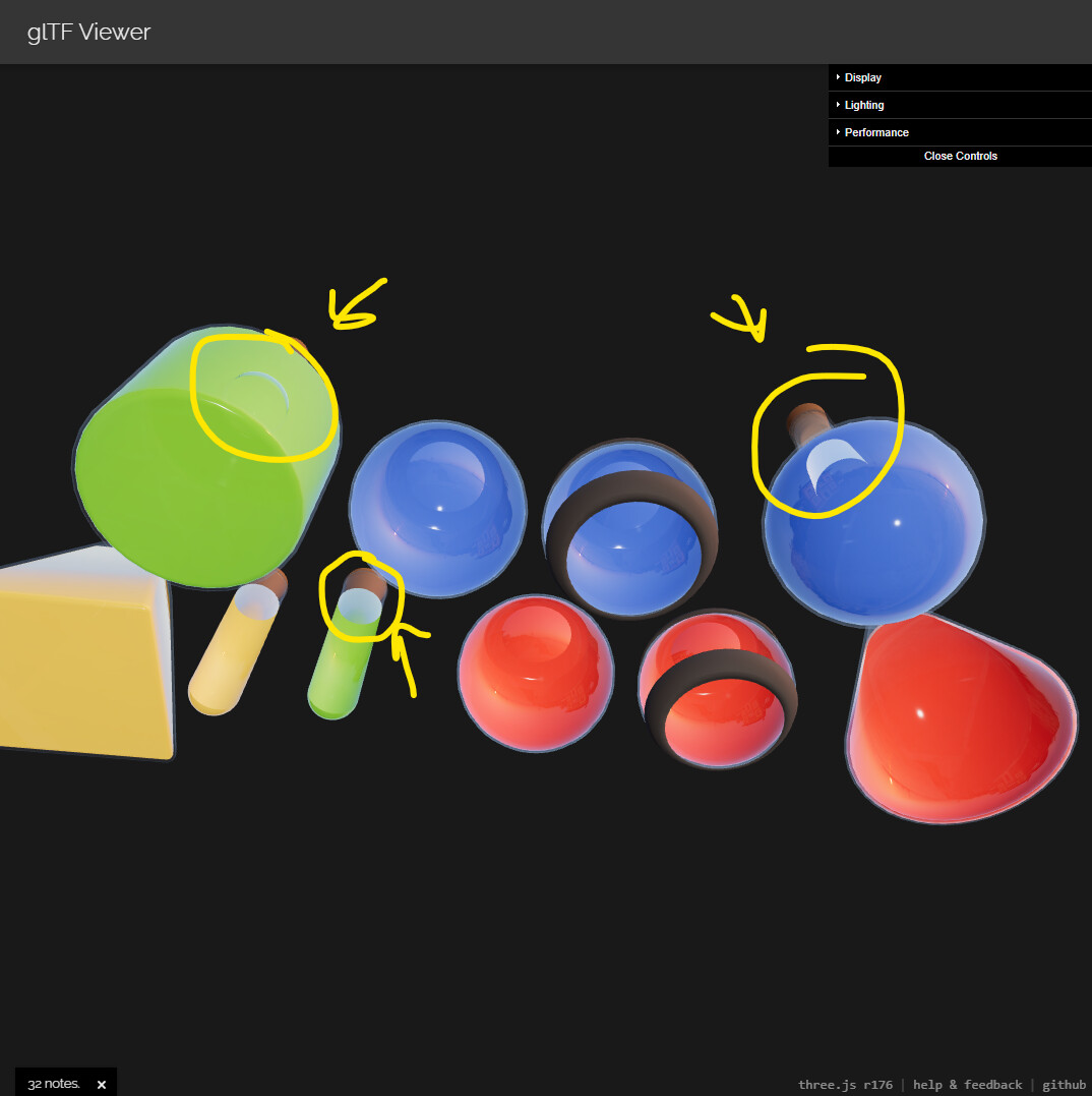 Something else interesting happens here that’s less obvious, because three.js does blending in LDR space, we lose some transparency on bright objects, such as this bottle neck shining through in Shade