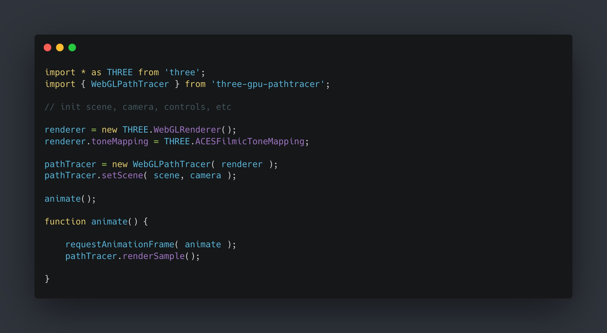 It’s been quite a bit of refactoring but v0.0.21 is out! This release is focused primarily on making the path tracer easier to use by wrapping the API and set up in a significantly more simple WebGLPathTracer API. Basic usage for setting up the path tracer has reduced significantly - a simple path tracing sphere example now takes less than 50 lines of code total.
