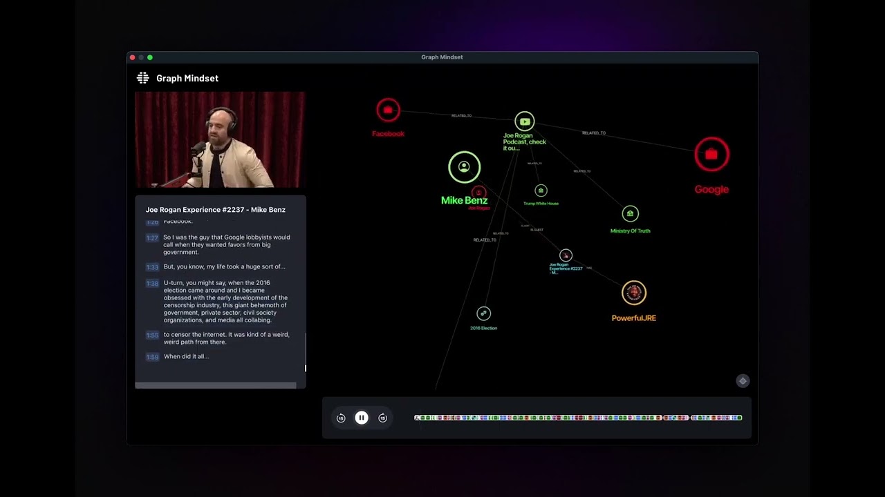 We have a lot of AI and Knowledge Graph tech we’re using on topic extraction and response workflows. This shows it as a support tool when reviewing new material with a lot of complex subjects - e.g. Mike Benz here throwing out acronyms of organizations every few seconds!