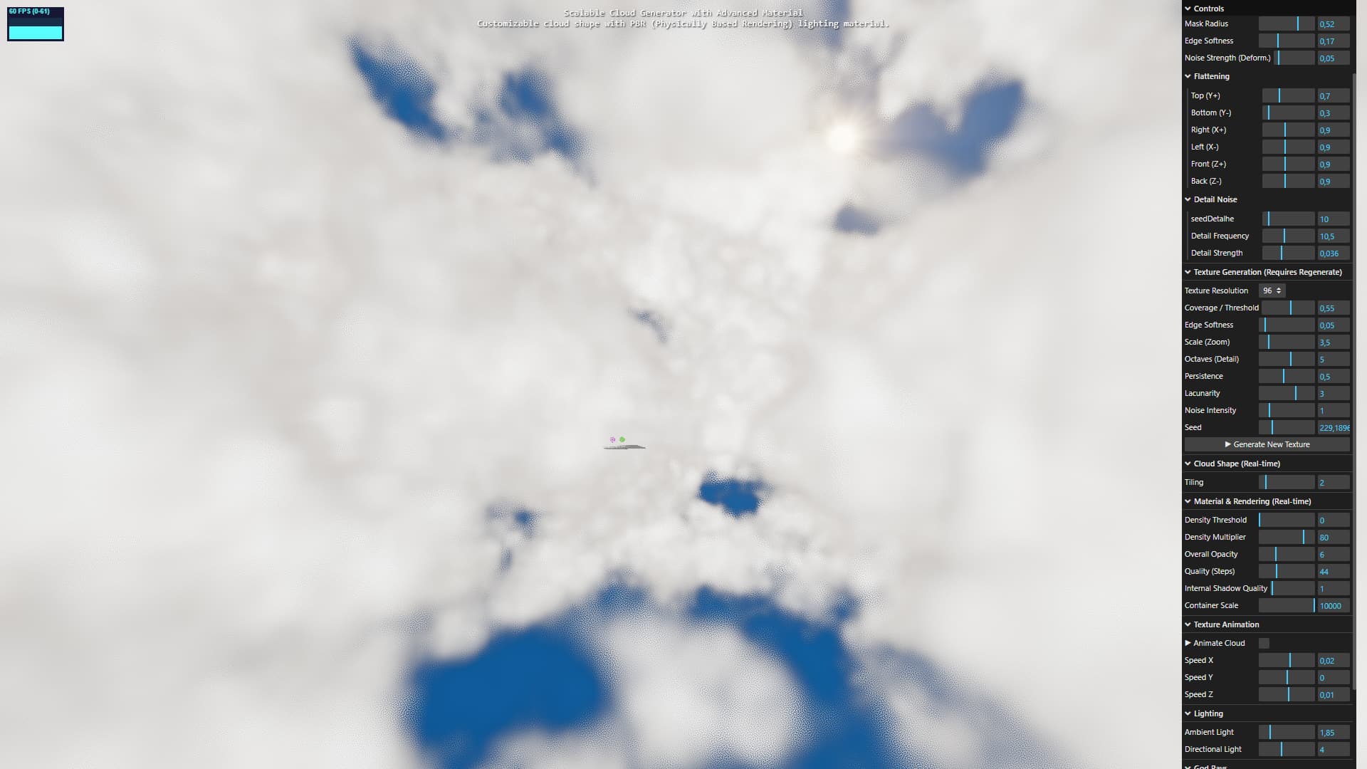 Customizable Cloud Shape: The overall cloud shape is defined by a deformable spherical mask with two layers of noise. All parameters (flattening, radius, noise strength, etc.) are controllable via the lil-gui panel.