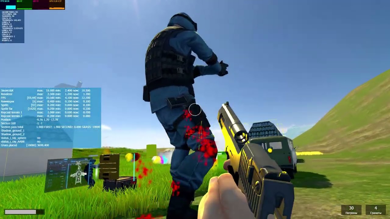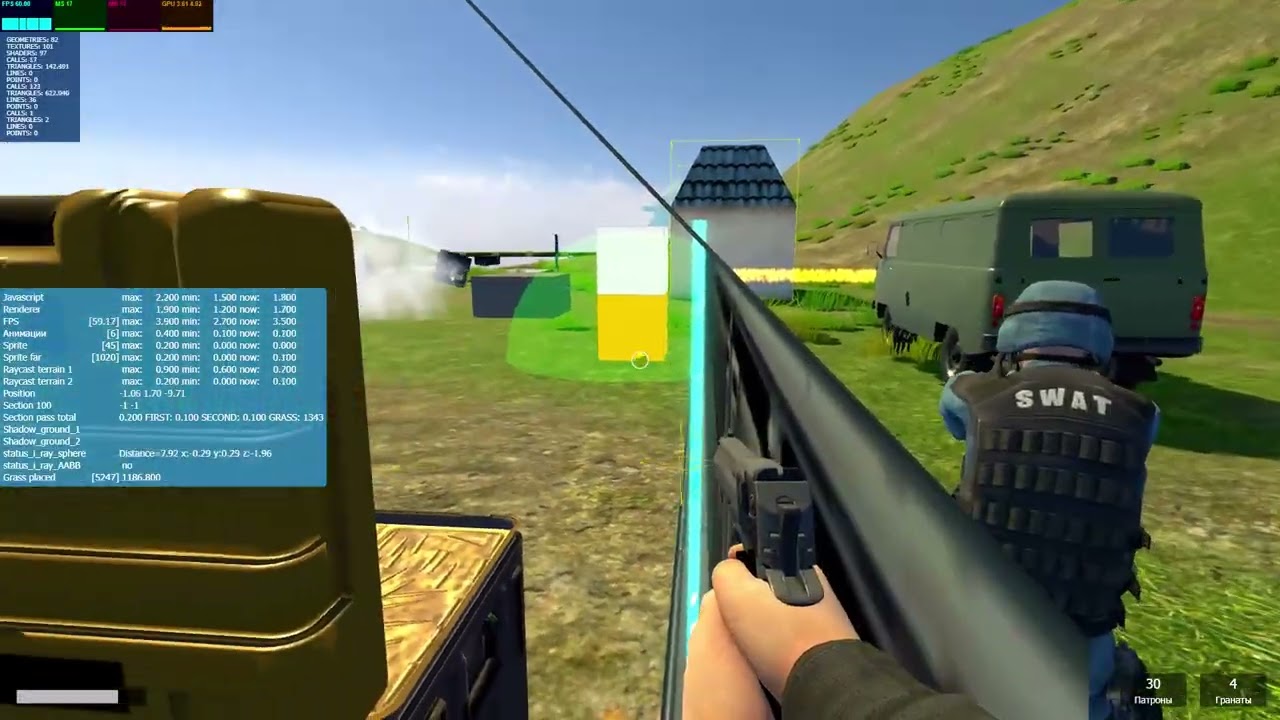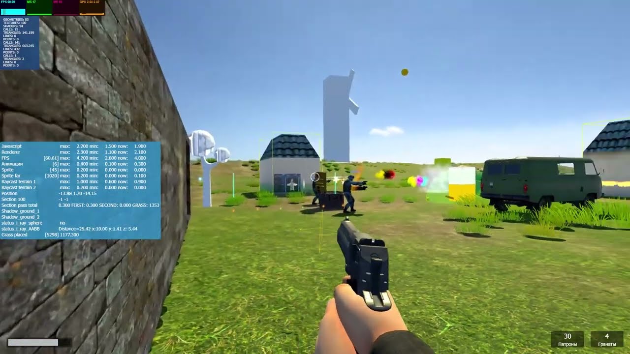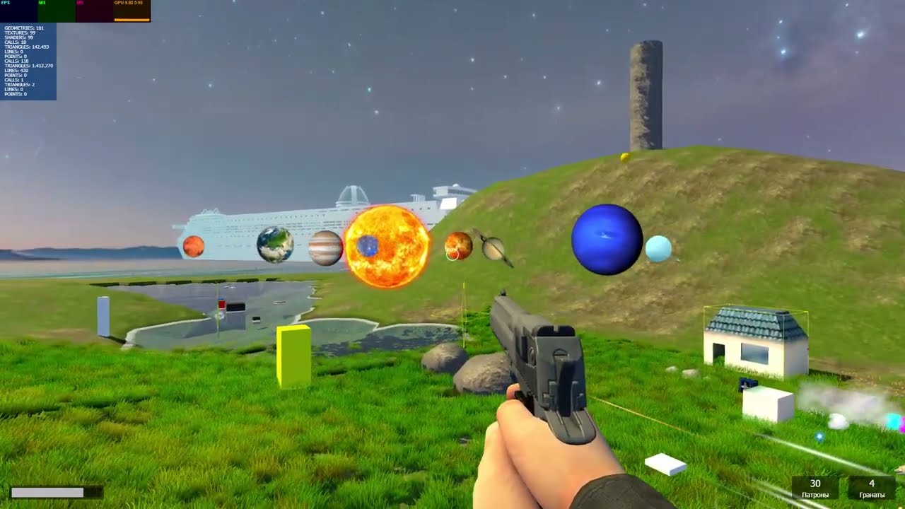 Added weapon, shot, reload, sway like on springs, jump, head bobbing, walking sound, jump sound, landing sound, flight, walking through walls, collision with objects, soft particles, etc.